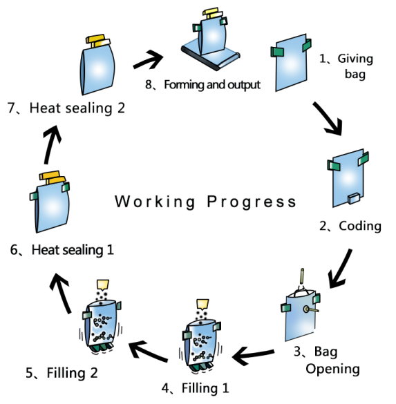 | Töltésérzékelő 1. Töltésérzékelés 2. Ha az érkező zacskót megfelelő feltöltés nélkül észleli, a zárószerkezet nem zárja le az egyetlen zacskót. 3.Az üres zsák a következő állomásra kerül, és szükségtelen hulladék nélkül újra felhasználható. |